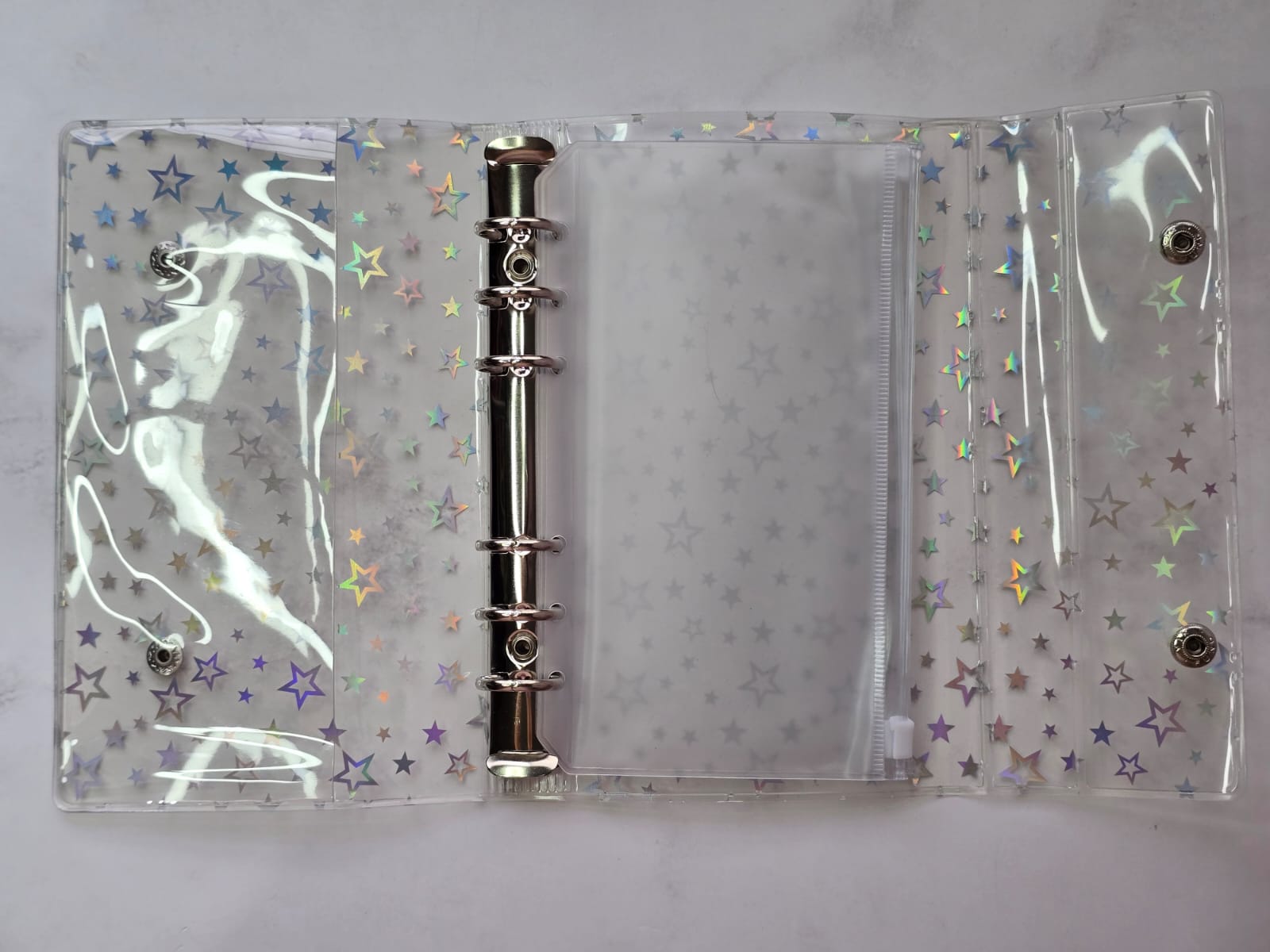 Esta carpeta en tamaño A6 cuenta con una doble abotonadura, incluye 10 sobres de pvc no personalizables y las etiquetas para nombrar tus categorías.