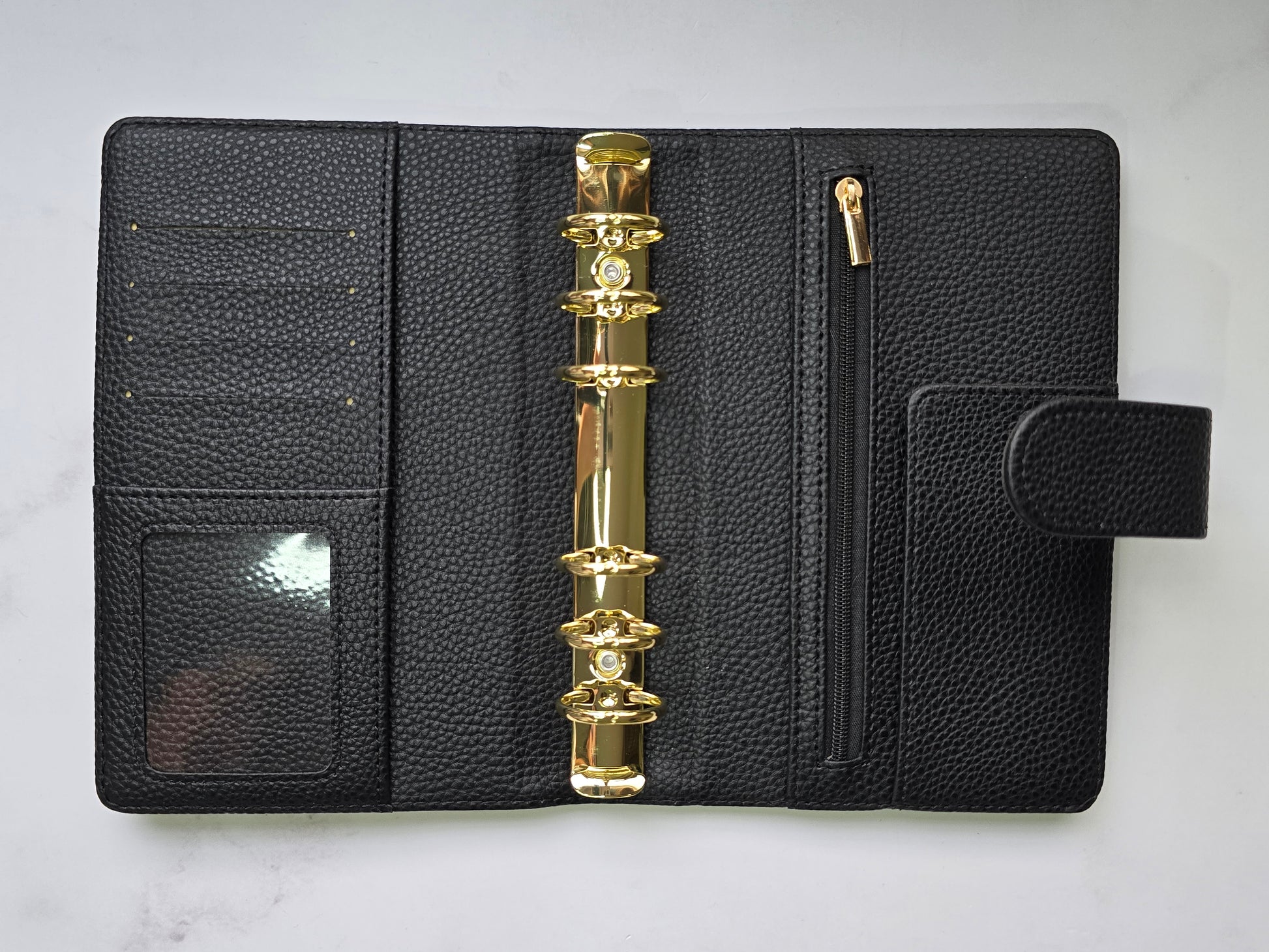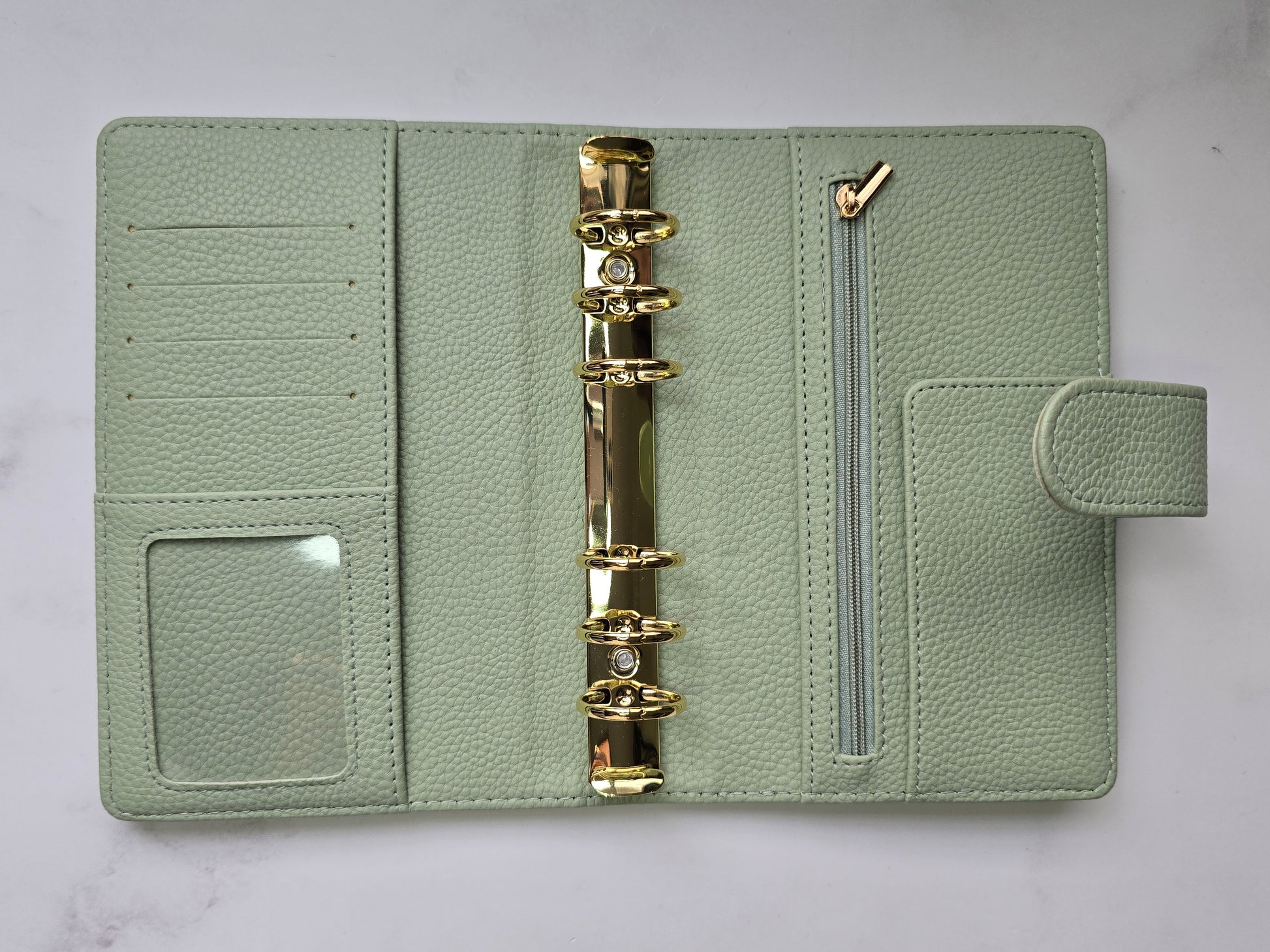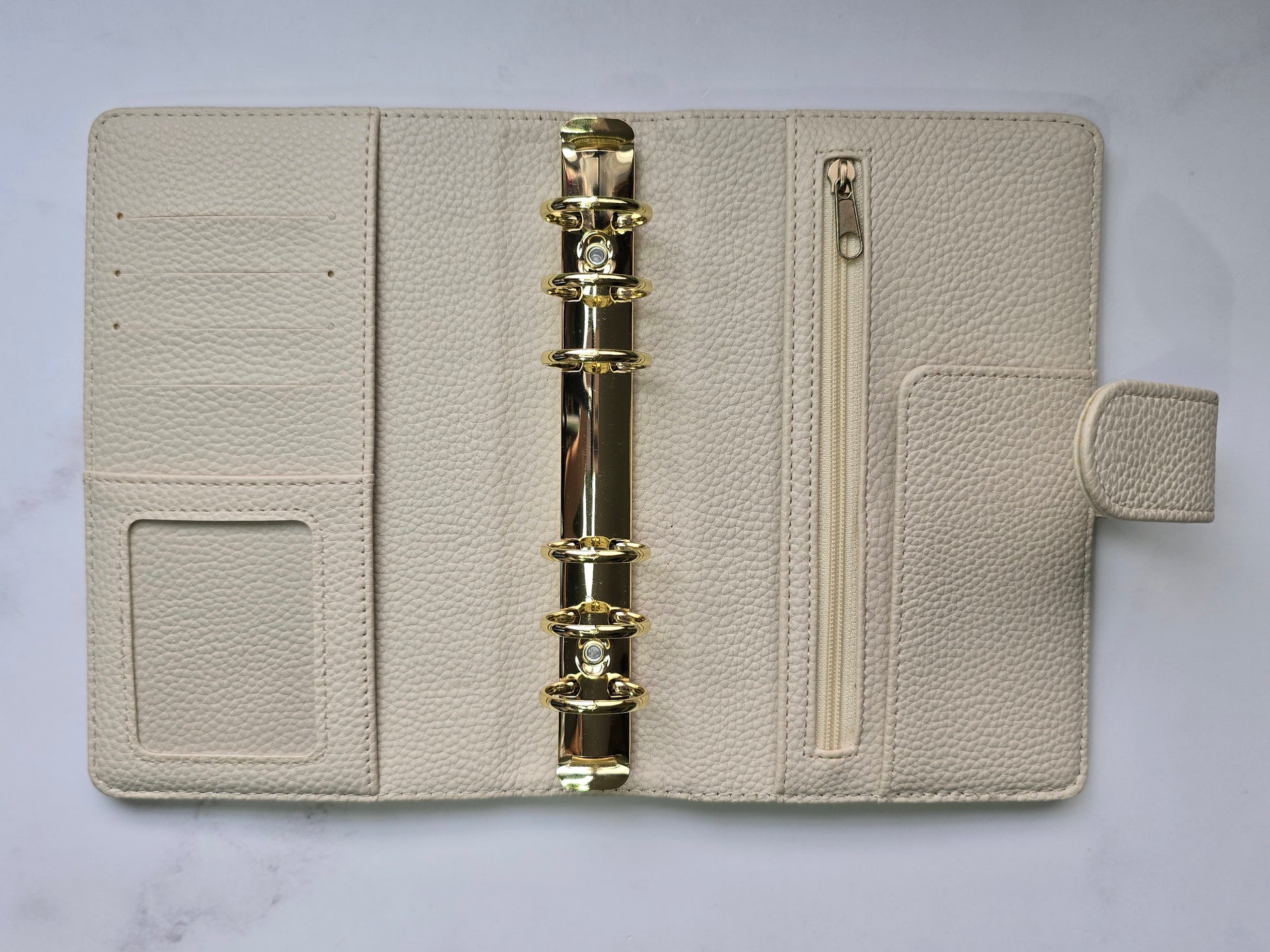 Combina belleza y funcionalidad en su tamaño A6 de anillas doradas, donde tus sobres encontrarán espacio gracias a su formato de 30mm, el tacto de la piel vegana con acabado de guijarros es suave al tacto y aporta una textura interesante y diferente.