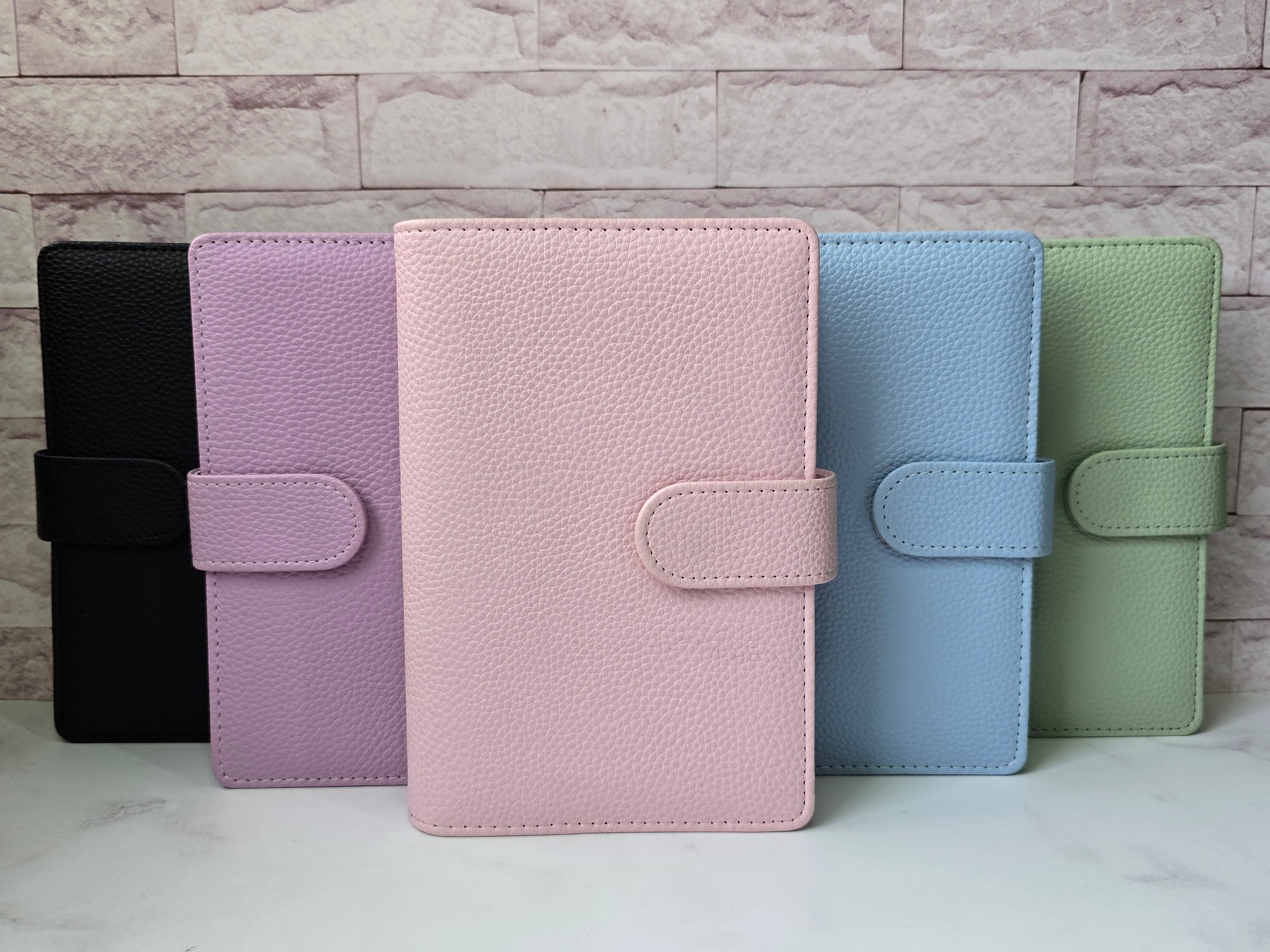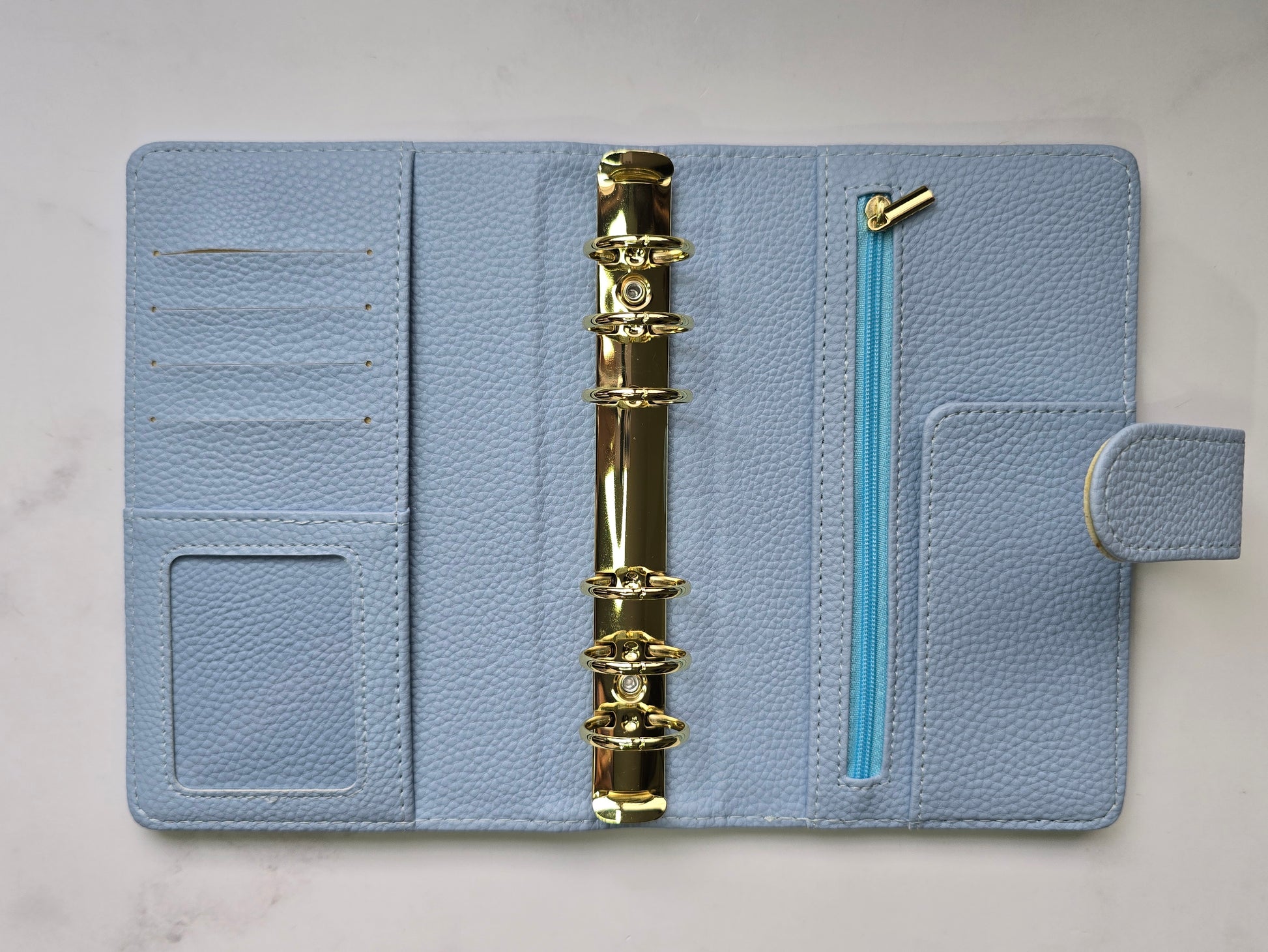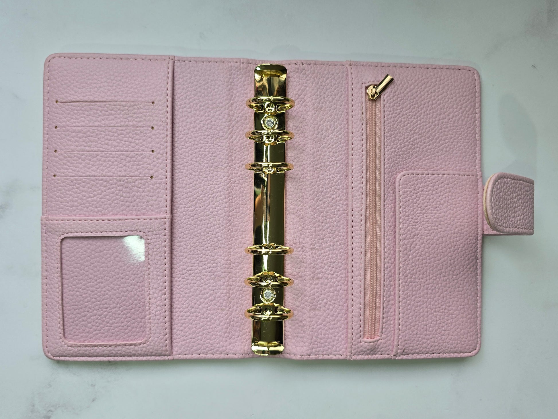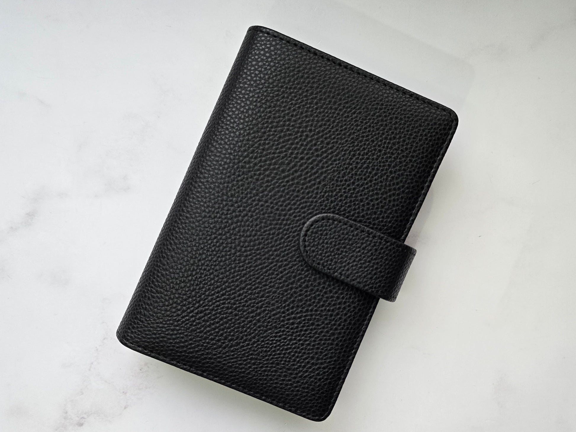 Combina belleza y funcionalidad en su tamaño A6 de anillas doradas, donde tus sobres encontrarán espacio gracias a su formato de 30mm, el tacto de la piel vegana con acabado de guijarros es suave al tacto y aporta una textura interesante y diferente.